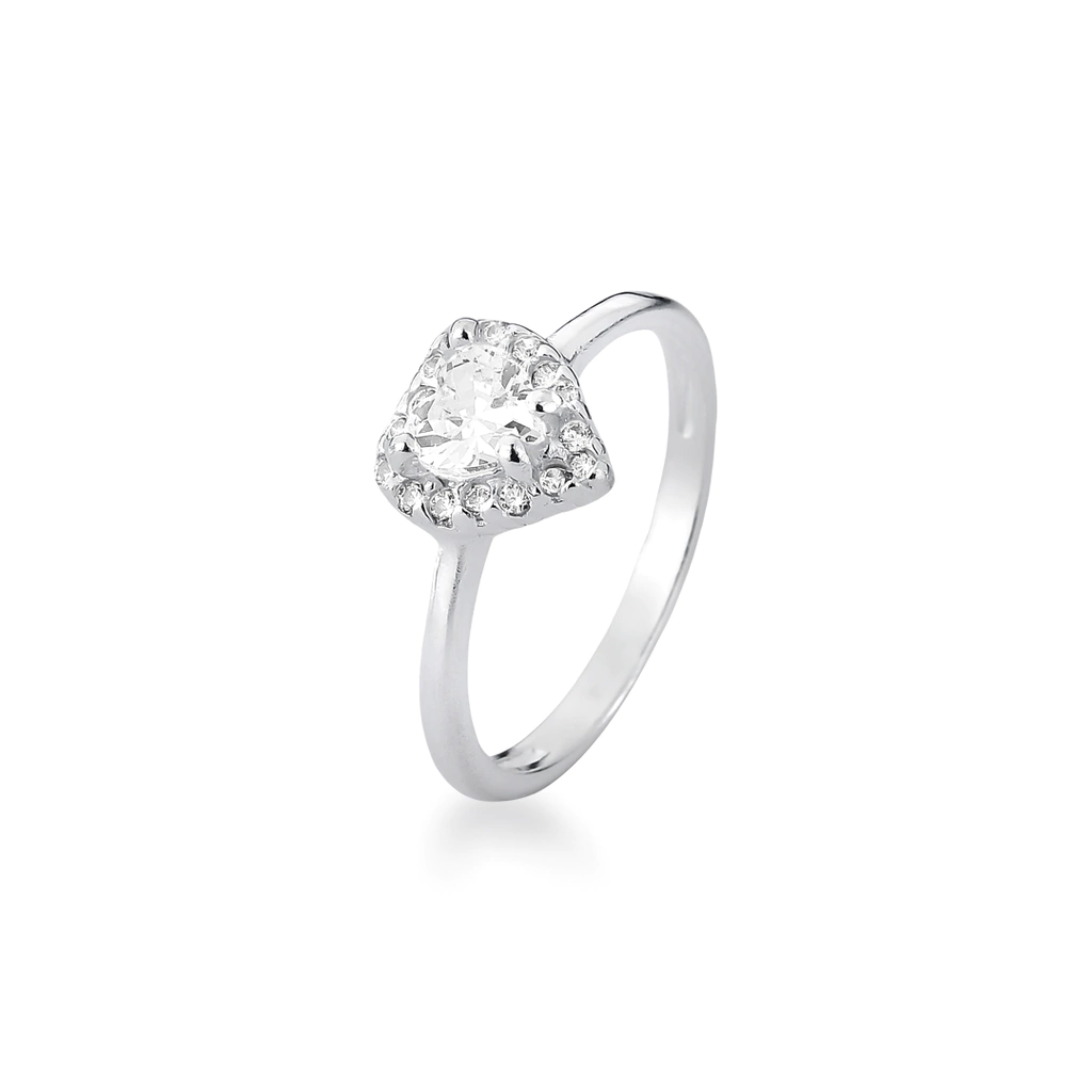 Anel Coração Cristal Cravejado de Prata 925, com a espessura de 2,2mm, tem um coração no centro da peça medindo 8,6 milimetros, além de ser feito com um material de excelente qualidade de durabilidade.