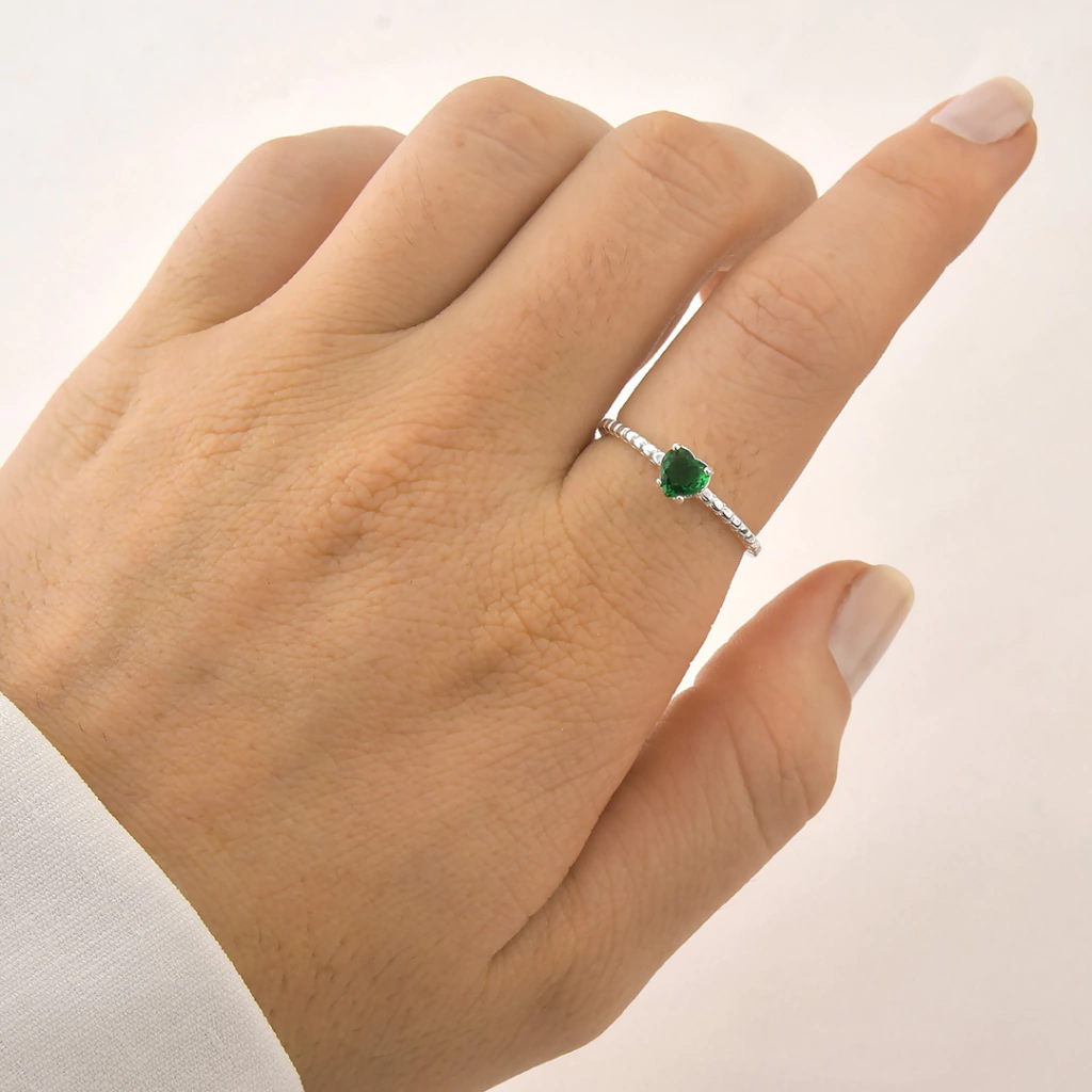 Anel Solitário Coração Verde de Prata 925, composto de prata lisa trabalhado em forma de bolinhos com um pedra central de cor Verde em forma de um coração;