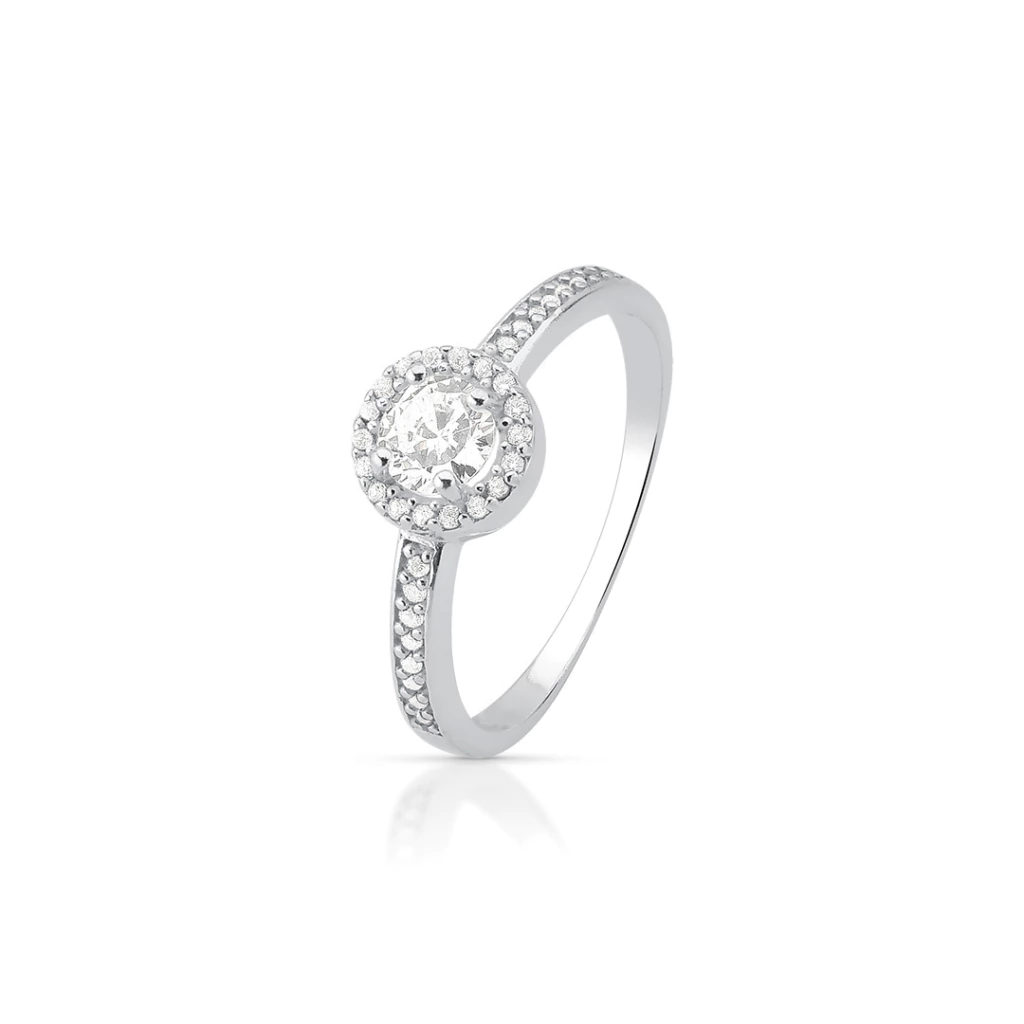 Anel Solitário Ponto de Luz Cravejado Cristal de Prata 925, composto de prata, cravação e pedra em forma de ponto de luz cercado por prata cravejado no parte superior do anel;