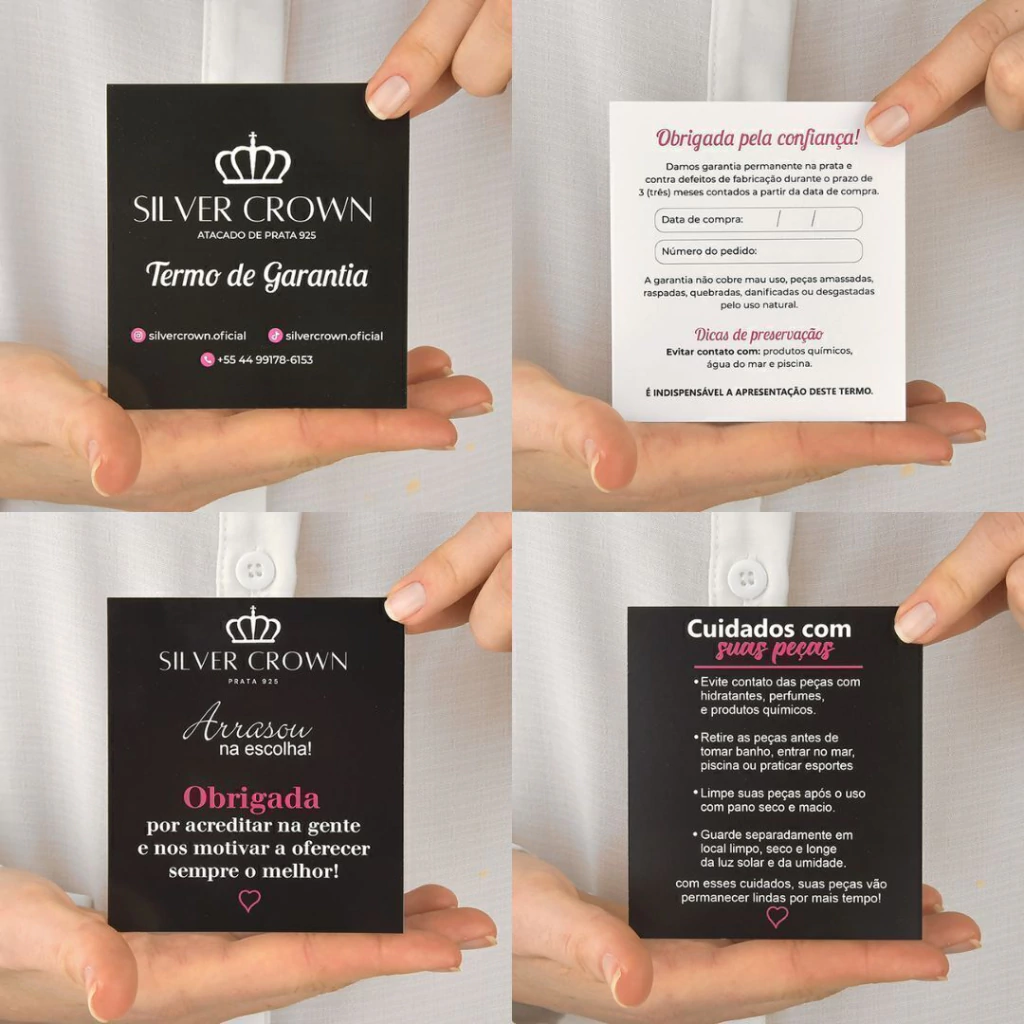 Nossas peças de Prata 925 são enviadas com Certificado de Garantia de Autenticidade da Prata 925, garantimos que nossa Prata tenha duração permanente no material. Diferentemente de Bijuterias, Joias em Prata 925 tem Duração Eterna assim como Ouro 18k.
