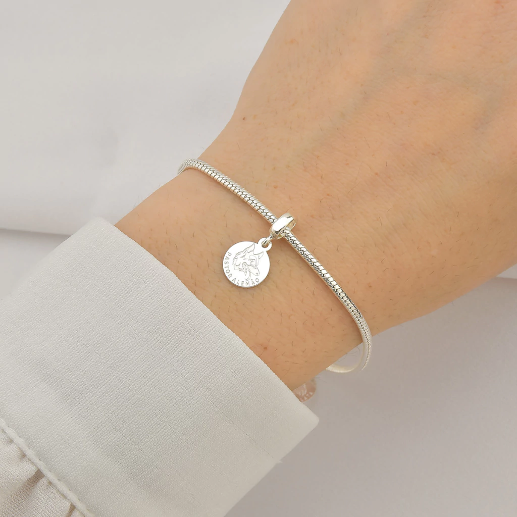 Berloque Círculo Pastor Alemão Laser Liso de Prata 925, este berloque é composto por prata liso em forma de círculo com um cachorro Pastor Alemão gravado com laser, com uma argola;
