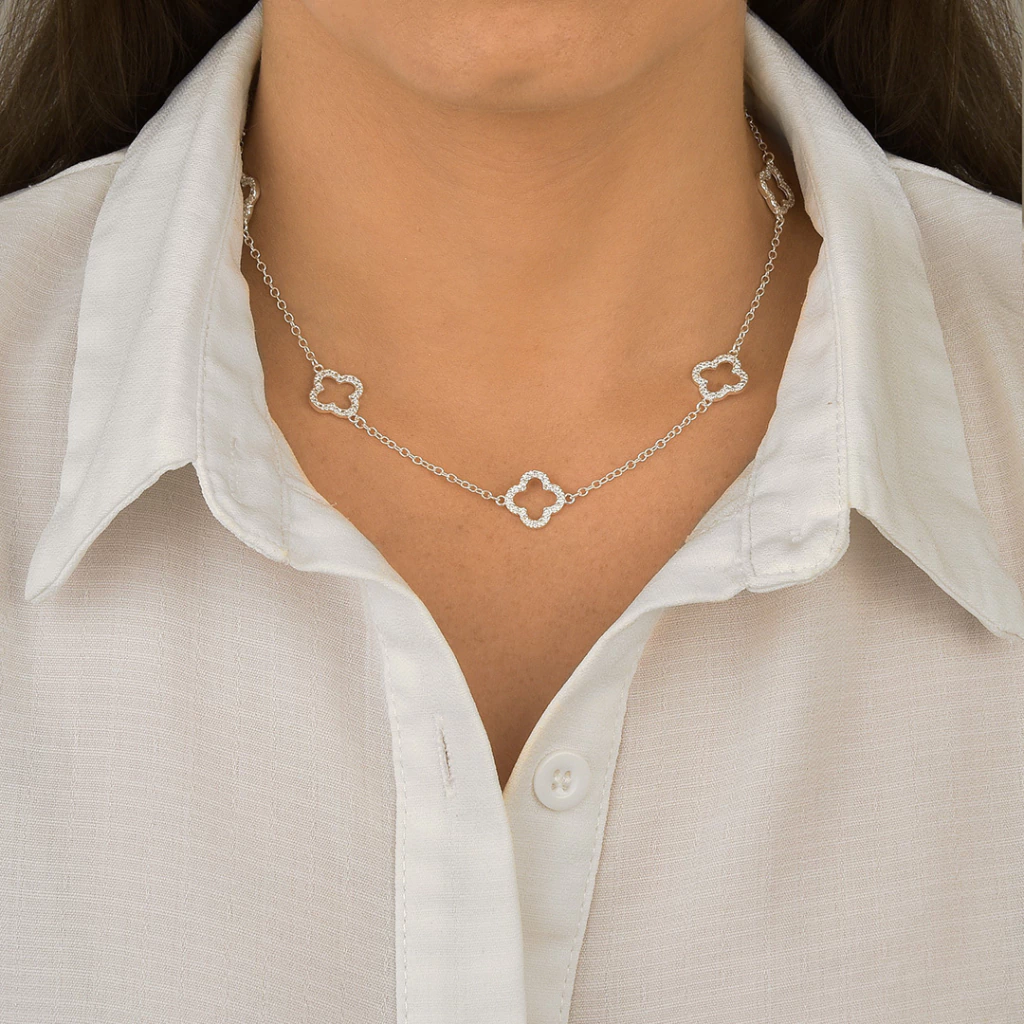 Choker 5 Trevos Cravejado Vazados de Prata 925, esse produto usa corrente de prata portugesa, vem com 5 pingentes, que é composto por prata cravejado em forma de trevo inspirado em Van Cleef;