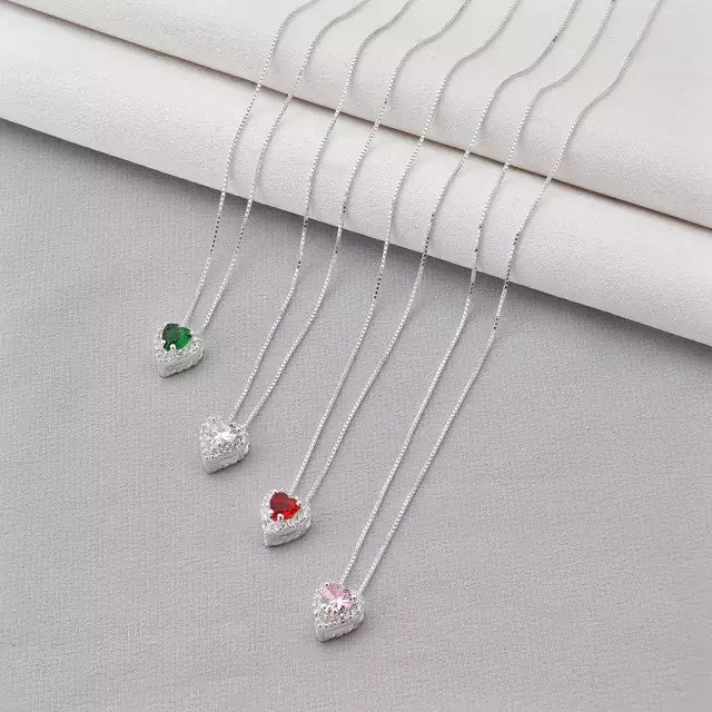 Gargantilha Coração 8mm Rosa Cravejado de Prata 925, esse produto usa corrente de prata veneziana, vem com Gargantilha Coração 8mm Rosa Cravejado, que é composto por uma pedra em forma de coração preso por 4 garras com um borda de prata cravejado;