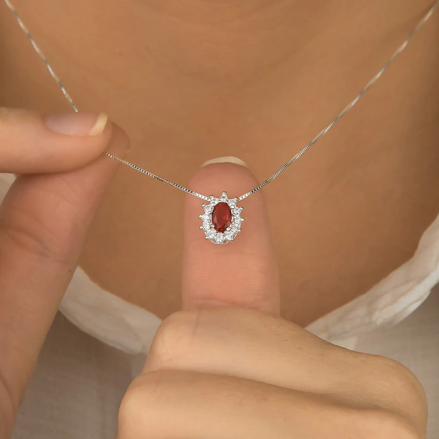 Gargantilha Ponto de Luz Oval Vermelho Cravejado de Prata 925, esse produto usa corrente de prata veneziana, vem com Pingente Ponto de Luz Oval Vermelho Cravejado, que é composto por uma pedra em forma de um oval (4mm x 6mm), rodeado de prata cravejado, com uma estrutura passante;
