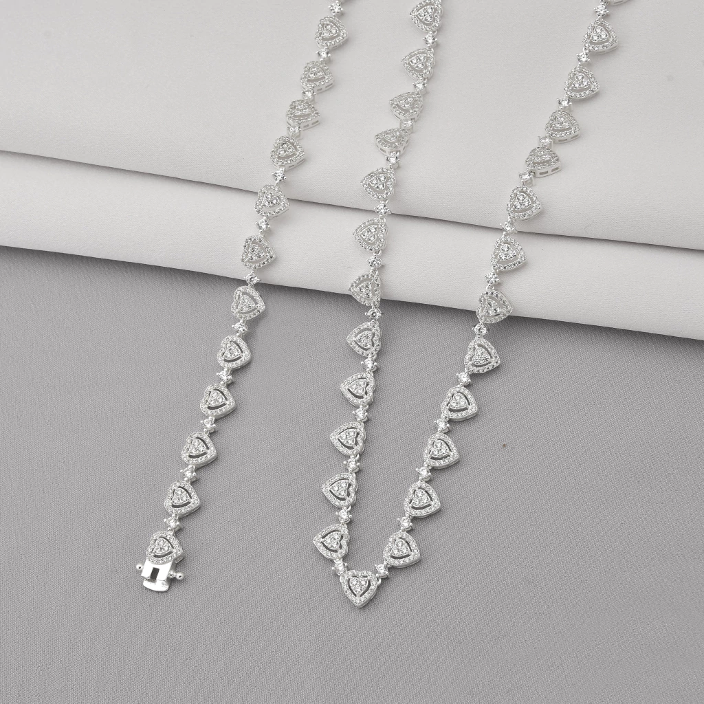 Pulseira Riviera Corações Cravejado e Ponto de Luz de Prata 925, vem com um corrente feito de corações cravejados parcialmente vazados e pontos de luz alternandos composto de prata para cravejado, é constituida material de excelente qualidade e durabilidade.